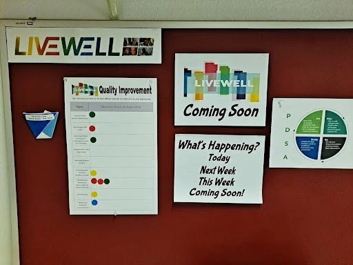 River Grove is located in Eugene, Oregon. They are a 60-bed memory care community that specializes in Alzheimer’s Disease. River Grove created a community quality board, which included our clock tool for tracking the timing of falls. They have introduced LiveWell to their entire staff and plan on adding more to their boards as the virtual learning collaborative progresses.